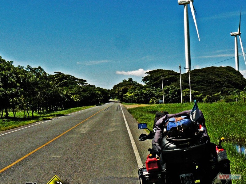 ya en Nicaragua por la ruta 2 una ruta con muchos campos de Molinos de vientos Modernos, Campos eólicos , estos generan energía eólica kilómetros y kilómetros de esto hasta llegar a Rivas donde me esperaba Javier Chamorro que me recibió en su casa, con el fui a la Playa San Jorge, Playa del Lago Nicaragua, en este lago se encuentra la isla Ometepe que cuenta con dos Volcanes el Maderas y el Concepción, es una bonita postal ver el lago, la isla y sus dos volcanes, pero es increíble la cantidad de bichitos voladores que no se que son, por suerte no son mosquitos, si no sería de terror, Muchas Gracias Javier por tu hospitalidad, si todo sale bien nos vemos a la vuelta!